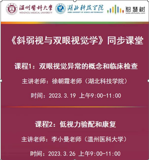 (通讯员:徐朝霞) 为深入推进教学改革创新,进一步加深校际合作交流,继3月19日pp电子游戏官网与温州医科大学开展《斜弱视与双眼视觉学》同步课堂之后,3月26日两校再次开展第二次同步课堂教学,此次课程内容为低视力康复与验配,主讲老师温州医科大学李小曼老师与pp电子游戏官网徐朝霞老师一起,给同学们呈现了一堂内容丰富、互动频繁的精彩课堂。