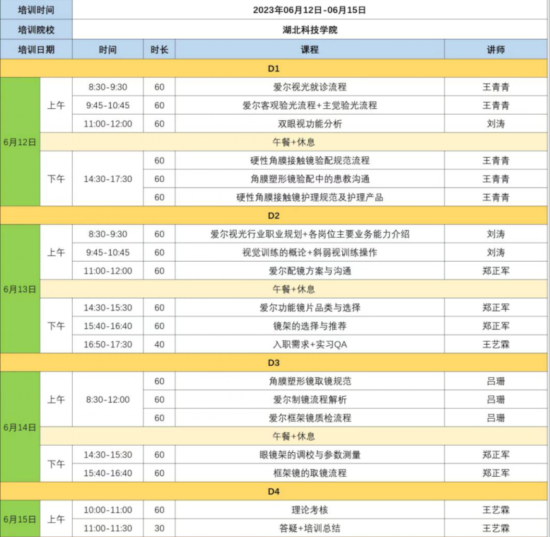 本次培训内容丰富,涵盖视光患者就诊流程,客观和主觉验光流程,双眼视功能分析,硬性角膜接触镜及角膜塑形镜验配规范流程、护理流程及患教沟通,视觉训练操作规范,功能镜片品类与选择,配镜方案与沟通,眼镜架的调校与参数测量,视光行业职业规划等内容。