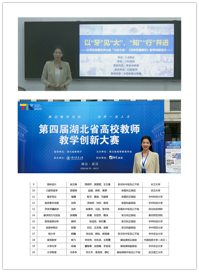 (通讯员 :沈昕) 4月20日—21日,湖北省第四届高校教师教学创新大赛在华中农业大学举行。口腔与眼视光医学院沈昕团队代表学校参与省赛角逐,并最终凭借《牙体牙髓病学》课程荣获湖北省新医科中级及以下组特等奖,晋级国赛,学校荣获优秀组织奖,这是pp电子游戏官网在教师教学创新大赛中的历史性突破。