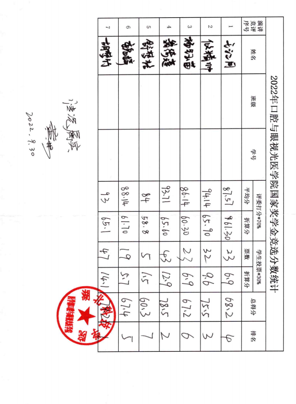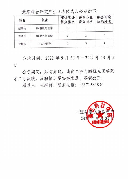 2022年口腔与眼视光医学院学生评优评先综合素质测评成绩公示
