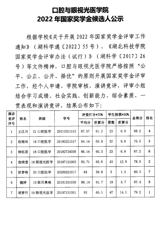 口腔与眼视光医学院2022年国家奖学金候选人公示