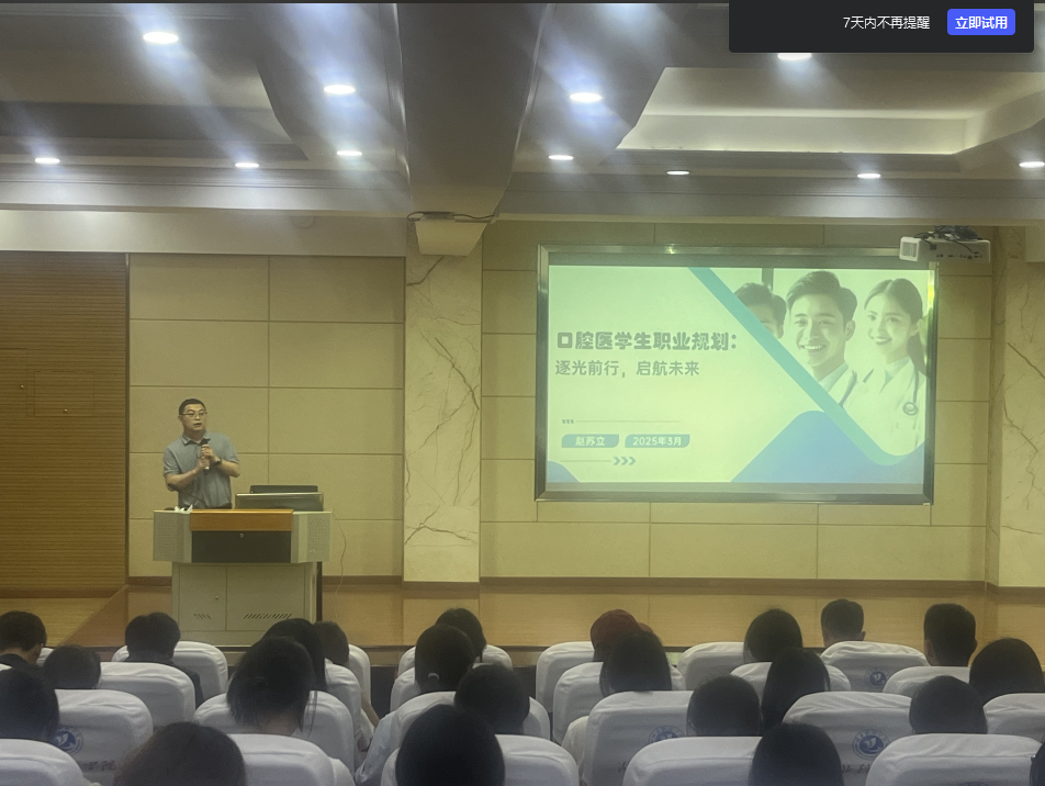 (通讯员 周彦,审核 程鹏)为帮助学生进行职业生涯探索,明确未来发展方向,使学生了解当前就业形势,4月10日,学院邀请三峡大学附属仁和医院口腔科主任赵苏立在教三-401开展“逐光前行,启航未来”——口腔医学生职业规划讲座。该讲座作为学院“学风建设”教育活动和学院“生涯规划指导课”的重要部分,旨在引导学生树立目标,明确责任,合理规划大学生活和学业,全面发展。讲座由学院党委副书记程鹏主持,辅导员周彦,2022级、2024级口腔医学专业学生参加。