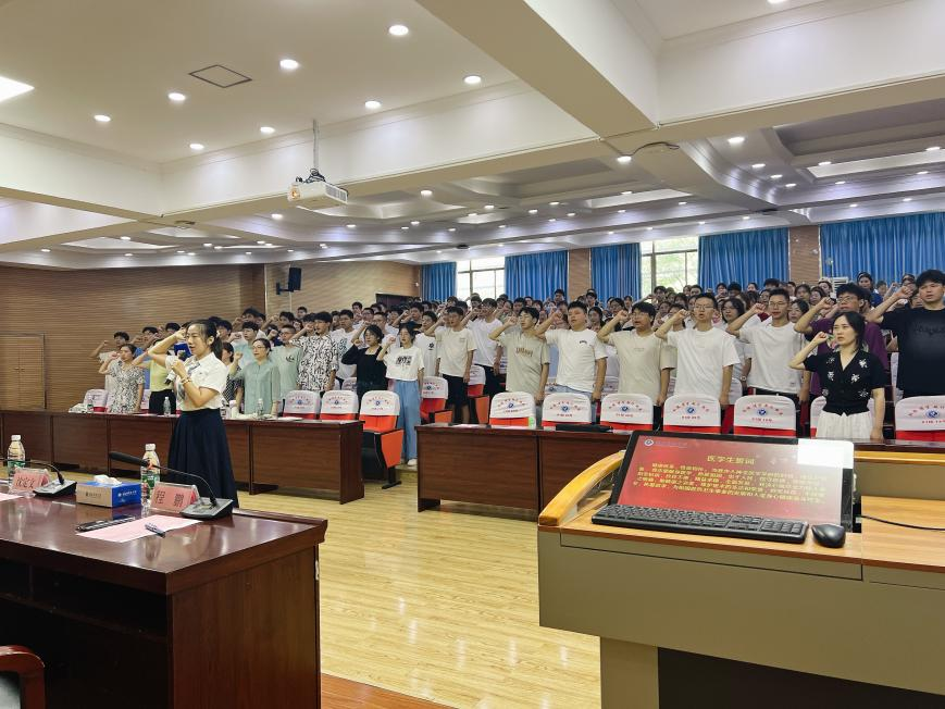 “健康所系,性命相托”“我决心竭尽全力除人类之病痛,助健康之完美,维护医术的圣洁和荣誉”,在21级口腔医学黄胜男的领誓下,全体新生举起右拳,庄严宣誓。