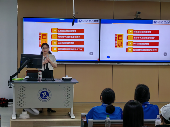 首先,学院分管实验室副院长黄玉婵同志强调了实验室安全对于学生、教师以及整个校园社会的重要性,实验室安全意识的培养是新生步入实验教学前的必修课,是每位学生科研生涯的第一步。随后通过引用实验室常见事故案例等,向同学们详细介绍了实验室安全的重要性、危险化学品的使用和防护、实验室危险源及如何做好实验室的安全工作,使同学们对实验室潜在的安全风险有了深刻的认识。