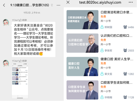 线上培训于9月1日至12日依托“8020齿生相伴”微信公众号开展,设置四门核心课程,包括“认识我们的口腔和口腔医学”、“健康口腔 美好人生”、“口腔医学生该如何做好科普”以及“口腔清洁和漱口水使用建议”。学生通过公众号完成理论学习并参与线上考核,考核通过者方可进入线下实操环节。
